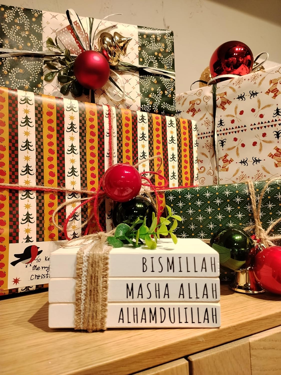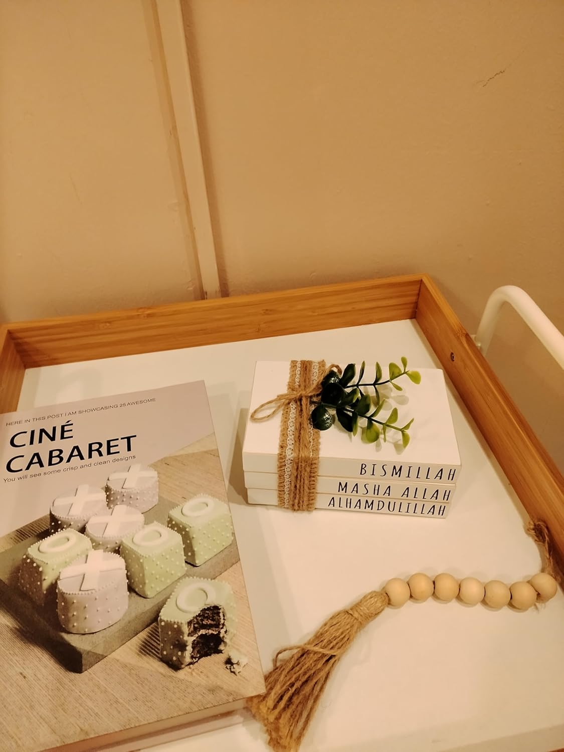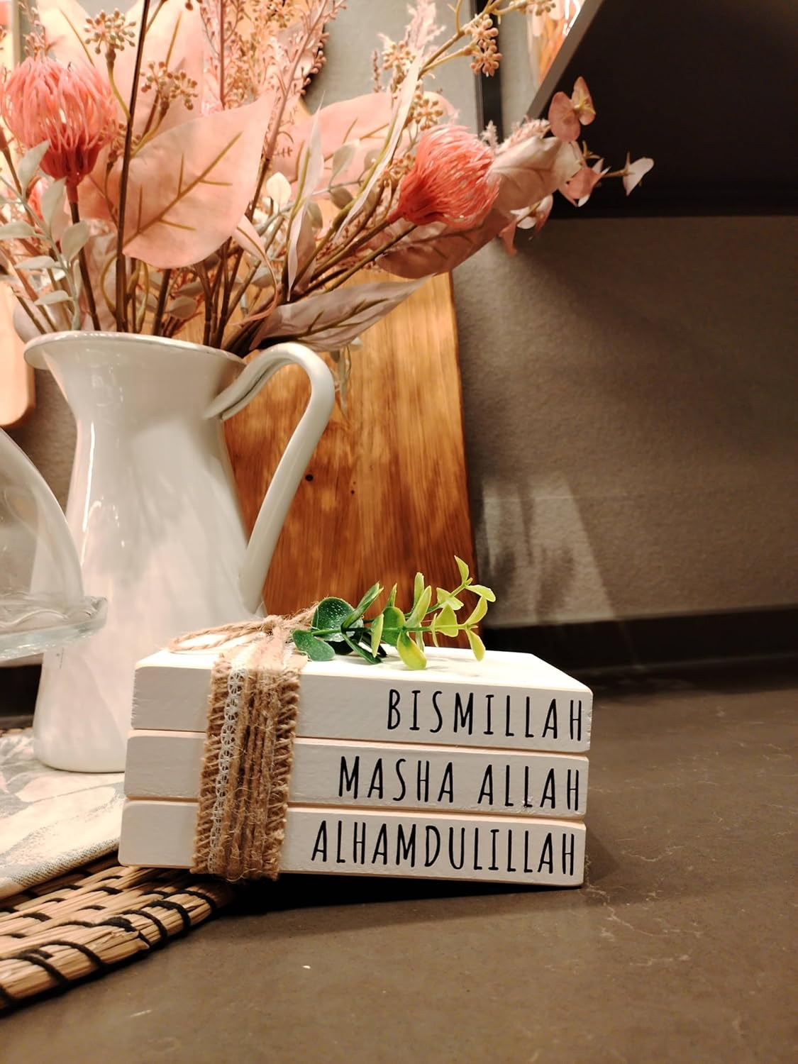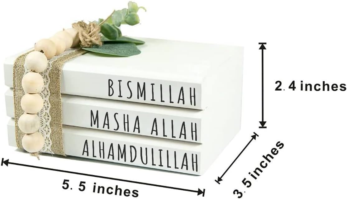 - Islamic Book Stack Decor : You will receive a decorative white wooden books set, it reads " Bismillah MashaAllah Alhamdulillah ",this set includes rustic twine and 1 piece wood beads with tassels.